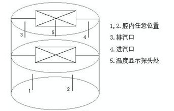 滅菌器內(nèi)裝滿(mǎn)培養(yǎng)基的錐形瓶,自下而上擺放。取5支經(jīng)過(guò)校正的留點(diǎn)溫度計(jì),將其中1支的探頭置于進(jìn)氣口處,1支探頭置于排氣口處,1支置于溫度控制和記錄的溫度計(jì)旁邊,其余的留點(diǎn)溫度計(jì)均勻分布在腔內(nèi)裝載的各處。溫度計(jì)分布情況同圖1。