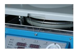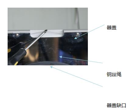 到達(dá)開(kāi)蓋的溫度后,用左手扶壓住機(jī)蓋,右手手指拉出器蓋正前方缺口內(nèi)的鋼絲繩。(見(jiàn)圖一)