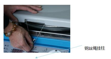 然后,按說(shuō)明書(shū)的要求和箱蓋上的警示牌的要求操作,依次松開(kāi)鎖銷,然后慢慢放松左手的壓力,鋼絲繩掛在掛柱上。(見(jiàn)圖三)
