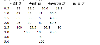 (三)紫外線滅菌法:波長(zhǎng)200~300nm,易穿透潔凈的水和空氣,用于空氣和物體表面滅菌。紫外線燈有效使用期一般為3000小時(shí)。 紫外線照射時(shí)間對(duì)微生物殺滅率見(jiàn)表: 照射時(shí)間(小時(shí)) 殺 滅 率 (%)