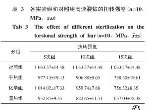 各實(shí)驗(yàn)組和對照組高速裂鉆的扭轉(zhuǎn)強(qiáng)度計(jì)算結(jié)果見表3,如表3示:和對照組相比,隨著滅菌次數(shù)的增加,干熱滅菌法、化學(xué)浸泡法和濕熱滅菌法組內(nèi)裂鉆的扭轉(zhuǎn)強(qiáng)度均逐漸減小。不同處理方法之間的比較顯示,在處理5次和10次時,干熱處理、化學(xué)浸泡和濕熱處理3種處理方法之間兩兩比較,扭轉(zhuǎn)強(qiáng)度的差異均有統(tǒng)計(jì)學(xué)意義(P<0.05);在處理15次時,化學(xué)浸泡和干熱處理引起的扭轉(zhuǎn)強(qiáng)度的差異無統(tǒng)計(jì)學(xué)意義,而濕熱處理組與化學(xué)浸泡和干熱處理組之間的差別均有統(tǒng)計(jì)學(xué)意義(P<0.05)。干熱滅菌法和化學(xué)浸泡法對裂鉆扭轉(zhuǎn)強(qiáng)度的影響相同且弱于濕熱滅菌法。