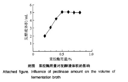 由附圖可知,果膠酶的添加量為0.2%~0.5%時,濾液的體積隨果膠酶的添加而增加,添加量>0.5%后再增加果膠的用量,濾液體積增加幅度較小,因此果膠酶的用量以0.5%為宜。