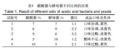 在發(fā)酵液中,酵母菌利用發(fā)酵液中的糖分,發(fā)酵成酒精,同時醋酸菌把生成的酒精轉(zhuǎn)化成醋酸,酸化發(fā)酵液,不同的菌比所產(chǎn)生的效果(表1)可知,選擇醋酸菌和酵母菌