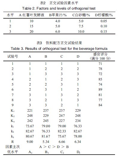 **優(yōu)水平為A2B3C2D2,即紅薯葉發(fā)酵飲料的**優(yōu)配方為紅薯葉發(fā)酵液15%,蘋果汁6.0%,白砂糖7.5%,檸檬酸0.10%,為了保持飲料的穩(wěn)定性,添加β-環(huán)糊精,添加量為0.8%。按正交試驗(yàn)得出的配方進(jìn)行飲料配制,得到的飲料經(jīng)感官評分為90分,說明此配方**佳。
